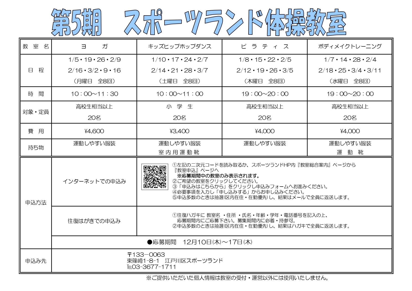 お申し込みはお電話またはスポーツランド窓口で受付ます。 みなさまのご参加をお待ちしております。