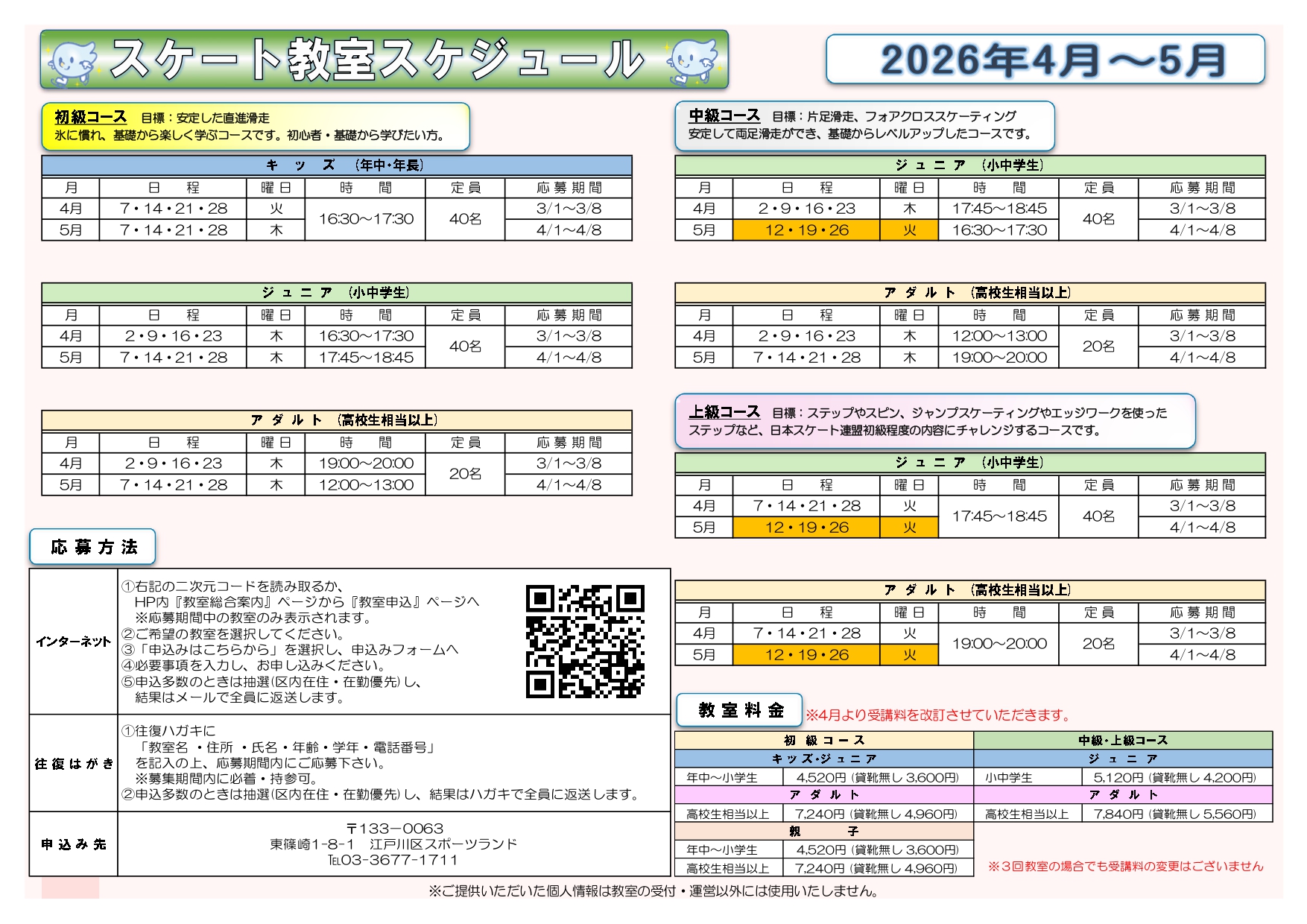 4月期スケート教室の追加募集をいたします。(受付開始3月15日(日)9時から)※先着順
