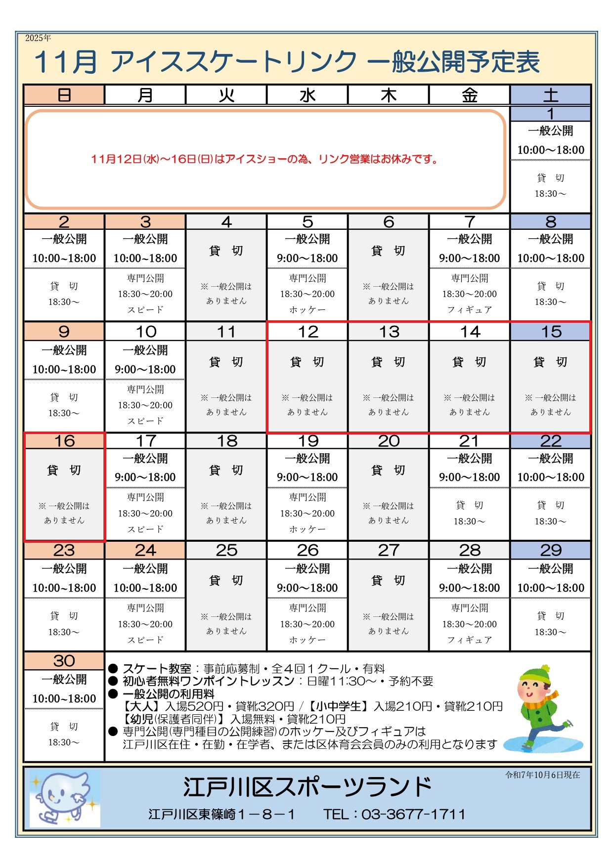 11月12日(水)~16日(日)は、アイスショー開催のため全館貸切日となります。