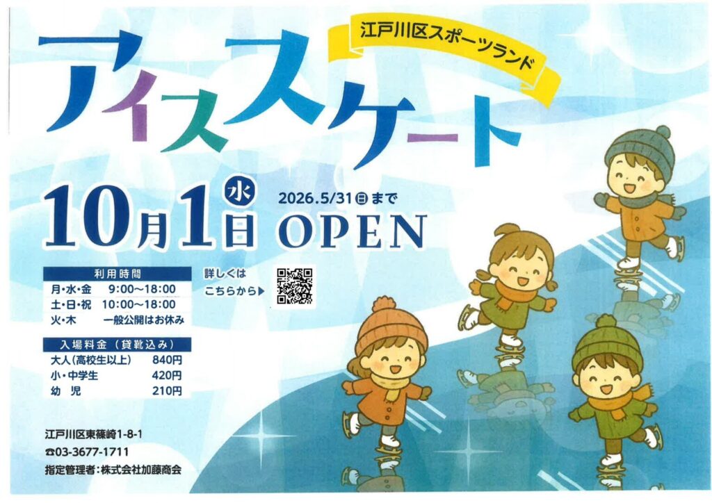 アイススケートリンクオープンのお知らせ calendar_month2025年9月20日 ◯期 間:10月1日(水)から5月31日(日) ◯時 間:9:00~18:00(土日祝は10:00~) ※火・木曜日は一般公開はお休みです。 ◯料 金 一 般⇨入 場 料 520円・貸 靴 料 320円 小中学生⇨入 場 料 210円・貸 靴 料 210円 幼 児⇨入 場 料 無 料・貸 靴 料 210円 ※オープン日10月1日(水)都民の日は小中学生の入場料が無料です(貸靴料は有料です)。