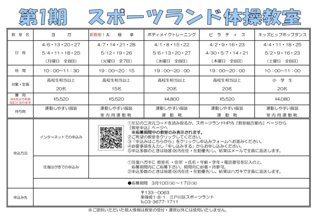 第1期(4~5月)体操教室・4月フットサル教室の追加募集をいたします。(受付開始3月24日(水)9時から)※先着順