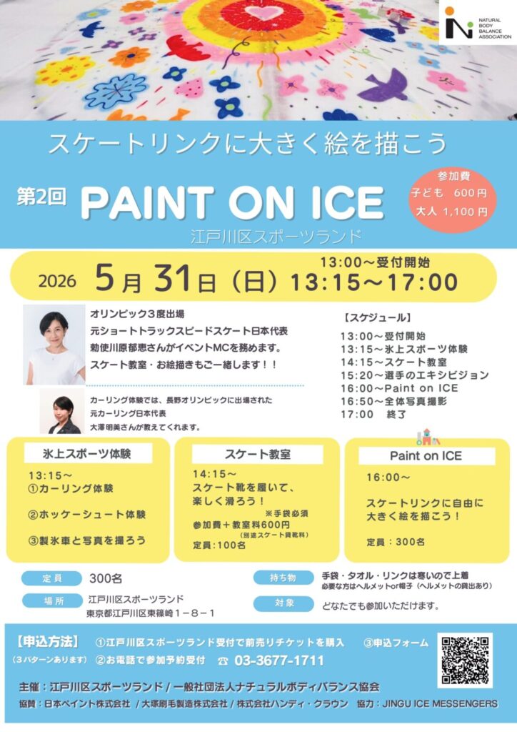 【ネット申込】第2回 PAINT ON ICE & 勅使川原郁恵スケート教室 開催のお知らせ calendar_month2026年4月6日 『第2回 PAINT ON ICE & 勅使川原郁恵スケート教室』 【日時】2026年5月31日(日) 13:15~17:00※ 13:00~受付開始 【参加費】子ども:600円大人 :1,100円スケート教室参加費+600円(貸靴別途) 【申し込み方法】 ①江戸川区スポーツランド受付で前売りチケットを購入②お電話で参加予約受付☏ 03-3677-1711③申し込みフォームから予約