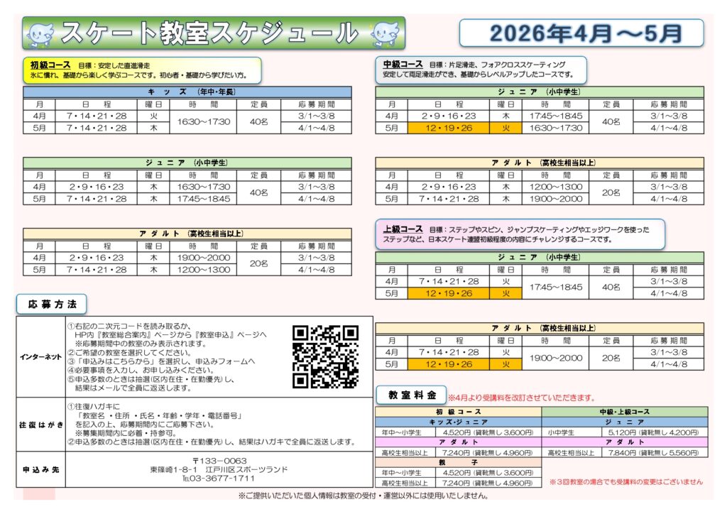 【追加募集】5月期スケート教室のおしらせ calendar_month2026年4月11日 5月期スケート教室の追加募集をいたします。(受付開始4月15日(水)9時から)※ 先着順 初級コース ・キッズ 【空き有り】 ・ジュニア 【空き無し】 ・アダルト 【空き有り】 中級コース ・ジュニア 【空き有り】 ・アダルト 【空き無し】 上級コース ・ジュニア 【空き有り】 ・アダルト 【空き無し】 ※4月15日時点 お申し込みはお電話またはスポーツランド窓口で受付ます。みなさまのご参加をお待ちしております。 スポーツランド TEL:03-3677-1711